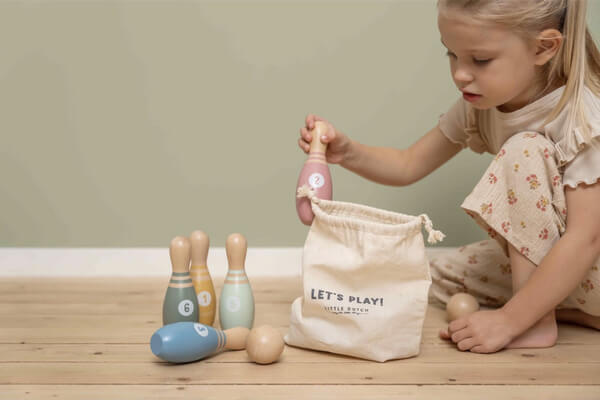 גלגלו את הכדור וראו אם ​​אתם יכולים להפיל את כל 6 הפינים. משחק נהדר וכיפי לשעות הנאה בחוץ. בדוקו אם אתם יכולים להפיל את הפינים אחד אחד או אולי את כולם בזריקה אחת. משחק שובב זה עוזר לקטנטן שלכם לפתח תיאום עין-יד על ידי גלגול הכדור וכיוון לפינים. לכל 6 הפינים מעץ יש מספר משלו כדי לעודד מיומנויות מתחילות לספור. הערכה מגיעה עם שני כדורי עץ ושקית כותנה לאחסון כל הפריטים.