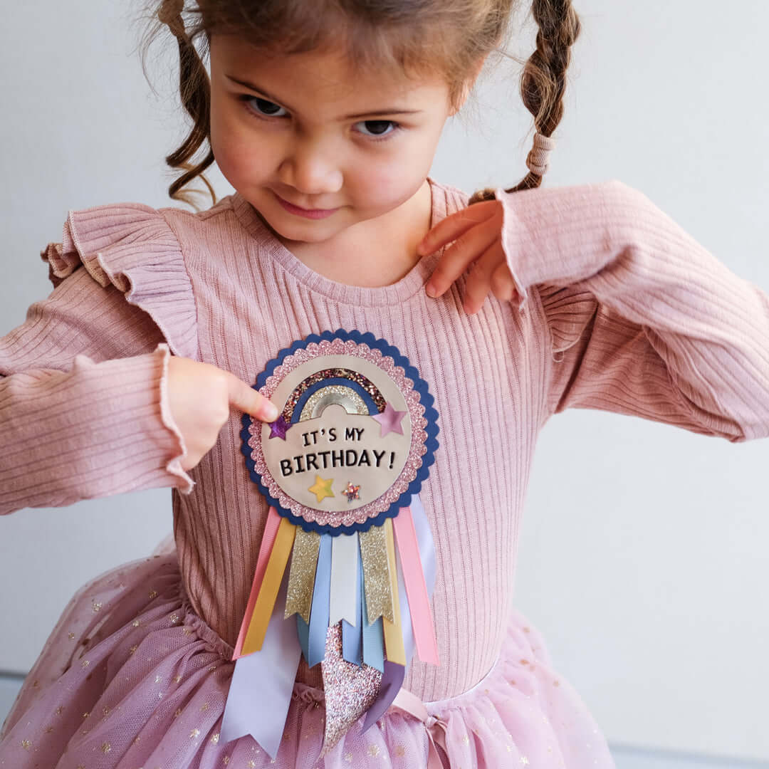 כולל קשת אפליקציה נוצצת ומככבת על שכבות של נצנצים מסולסלים ובד עור מתכתי
